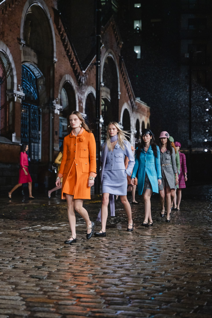 Even today, concert halls abound, and fans from all over the world embark on a pilgrimage following in the footsteps of their idols. Keeping in mind that creative, urban spirit, the Chanel show took place on Thomas Street at dusk, on a typically chilly winter’s evening. The rain, another typically English and Mancunian trait, even made an appearance for the occasion.