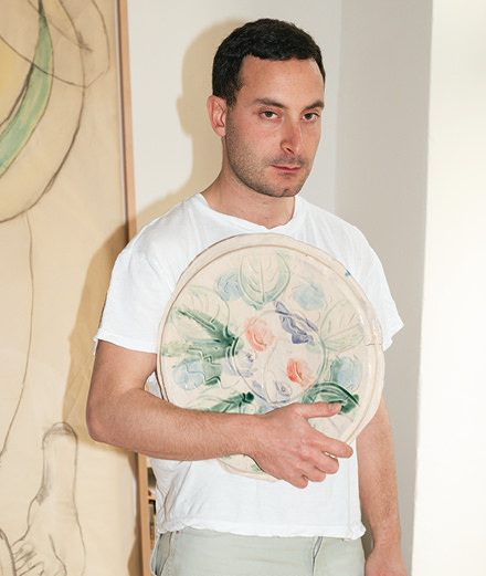 • Watching Matthew Lutz-Kinoy at work on one of his large paintings, which (sometimes) include mythological characters, you get the impression of a gushing well of creativity. He works quickly, and knows exactly what he’s doing and where he’s going. But Lutz-Kinoy, with his panoramic curiosity, refuses to confine himself to just one medium and is constantly exploring new horizons. Costumes, disguises and fashion (he collaborates with the stylists at Eckhaus Latta) form part of the various performances he puts on, which are often realized in partnership with other artists. In March, at New York’s New Museum, it was with the music producer Sophie (aka Samuel Long, with whom he founded a group) that Lutz-Kinoy staged a reading about the influence of contemporary pop music, while in April at MoMA/PS1 he’s teaming up with artist Tobias Madison to stage a play by cult queer Japanese dramatist Shuji Terayama. And this summer, in Naples, he’ll be displaying his ceramic masks at the incredible Palazzo Donn’Anna, a place of mysterious legends that looks out across to Mount Vesuvius. But it was in Los Angeles, at his new studio, that Numéro met up with the eclectic young artist.