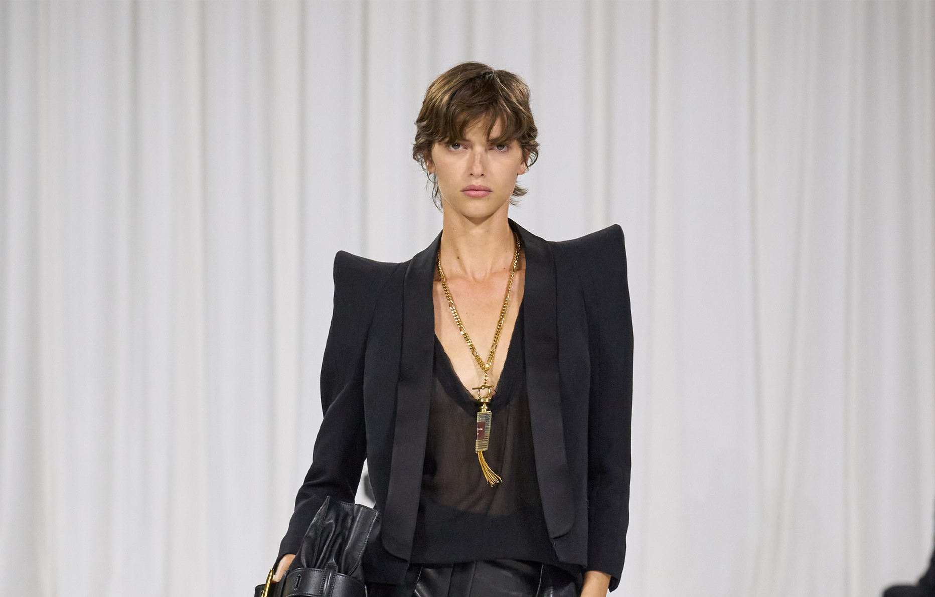 Mais cette saison, malgré un travail exceptionnel des ateliers Balmain sur les vêtements, que l’on devine notamment lors du passage d’une sublime robe longue aux centaines de milliers de perles arborée par la top model Maggie Maurer, ce sont les accessoires qui volent la vedette du show.