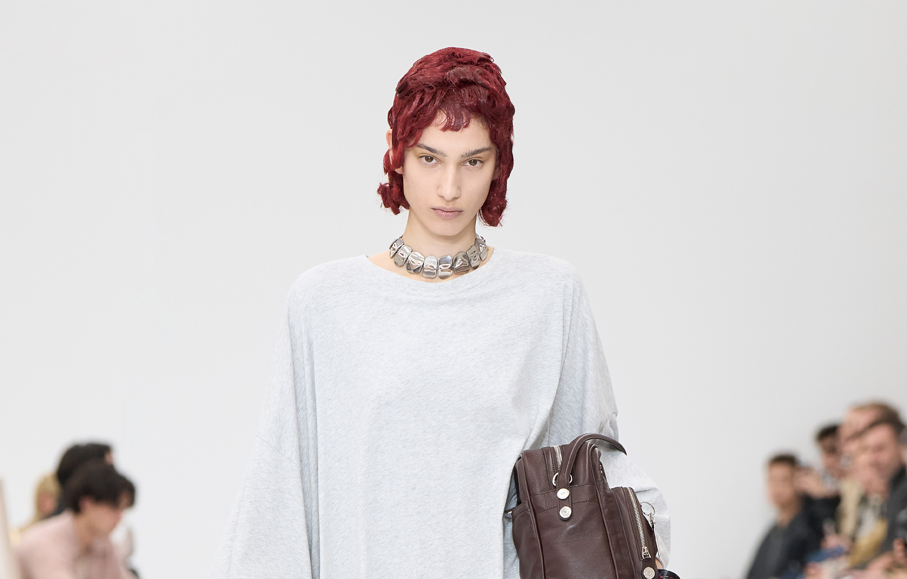 Des superpositions de matières aux pulls à moitié enfilés, ce show Acne Studios printemps-été 2025, donne l’impression que les mannequins se sont habillées en toute hâte, presque naïvement et sans réfléchir, et divulgue l’idée d’une mode forte et spontanée.