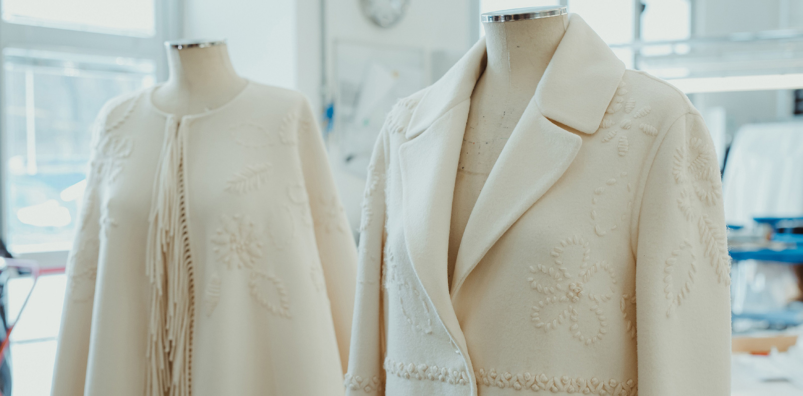 Au sein de ce décor lumineux et olfactif, les dizaines de silhouettes s’enchaînent telles des formes spectrales et surhumaines. Les doudounes, les robes en denim délavé et les capes en laine immenses traînent au sol, les manches sont ultra longues et pendent bien au-delà des mains, le feutre d’alpaga compose des vestes et jupes rigides, les épaules montent vers le ciel tandis que les vestes duvet en nylon recyclé composent autour des corps des protubérances impressionnants. Si les ensembles Rick Owens apparaissent souvent comme des armures de protection, le créateur contraste cet aspect en proposant cette saison des robes fourreau et bustier dont les drapés volumineux accentuent à la fois le mouvement et la brillance de la matière.