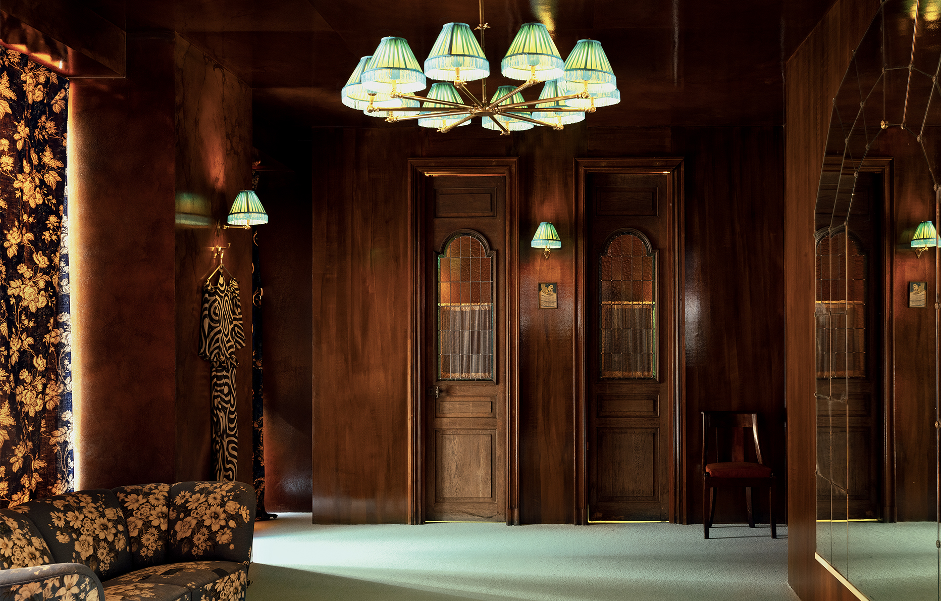 mêle charme français et style américain, entre meubles patinés, soie et antiquités. L’histoire qu’il raconte ? Celle d’un hôtelier français fan de pêche à la mouche. En témoignent en effet les détails décoratifs comme les cannes à pêche vintage suspendues aux poutres…